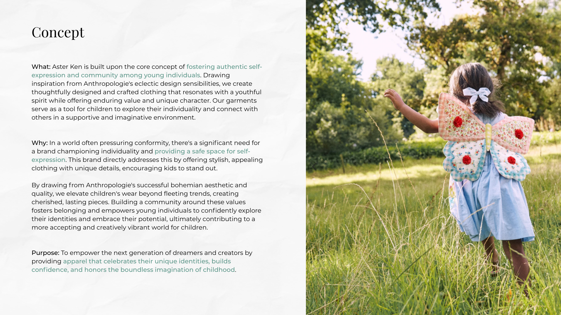 My senior capstone was a vibrant journey into the world of kids' apparel, creating Aster Ken, a brand I dreamed up for the URBN portfolio. The goal was to gently introduce the signature URBN aesthetic to a fresh generation, building a foundation for lifelong customer loyalty. This was a full-circle moment, allowing me to weave all my learnings into one brand story. It began with a 70-page research and ideation phase and wrapped up by bringing my concepts to life with mockups and AI renderings thanks to Luma AI.